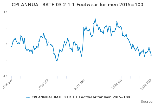 Download this time seriesCPI ANNUAL RATE 03.2.1.1 Footwear for men 2015=100