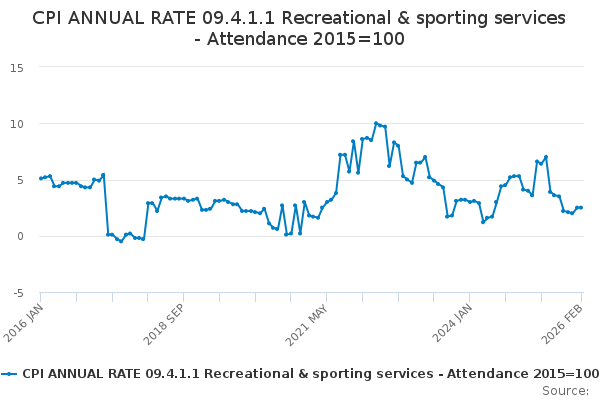 Download this time seriesCPI ANNUAL RATE 09.4.1.1 Recreational & sporting services - Attendance 2015=100