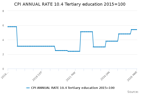 Download this time seriesCPI ANNUAL RATE 10.4 Tertiary education 2015=100