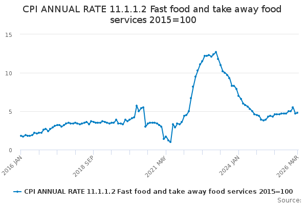 Download this time seriesCPI ANNUAL RATE 11.1.1.2 Fast food and take away food services 2015=100