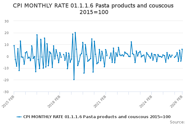 Download this time seriesCPI MONTHLY RATE 01.1.1.6 Pasta products and couscous 2015=100