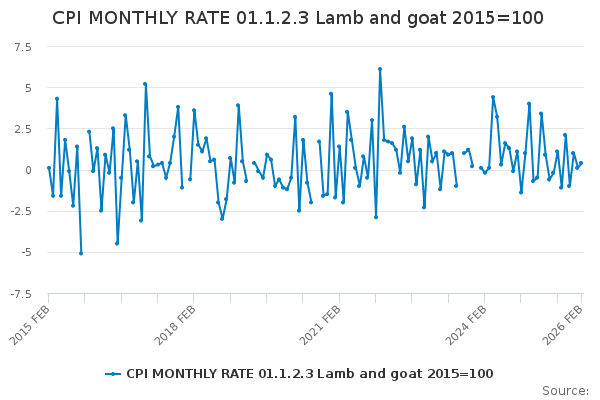 Download this time seriesCPI MONTHLY RATE 01.1.2.3 Lamb and goat 2015=100