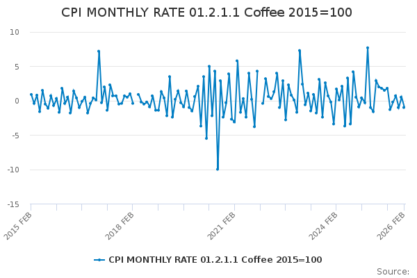Download this time seriesCPI MONTHLY RATE 01.2.1.1 Coffee 2015=100