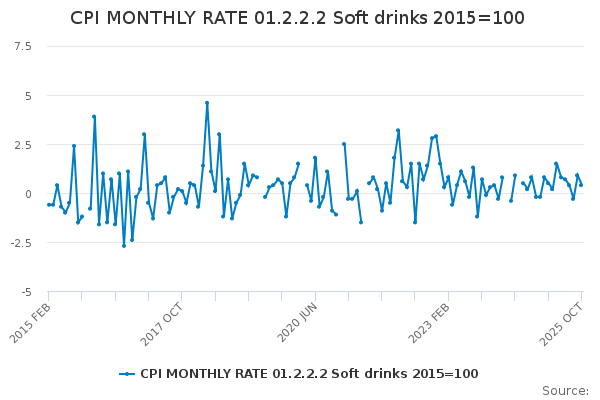 Download this time seriesCPI MONTHLY RATE 01.2.2.2 Soft drinks 2015=100