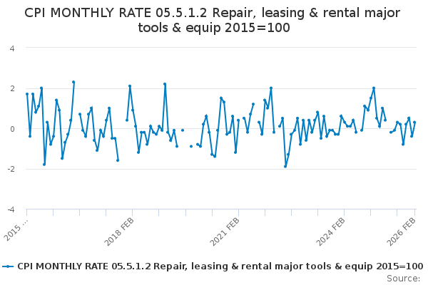 Download this time seriesCPI MONTHLY RATE 05.5.1.2 Repair, leasing & rental major tools & equip 2015=100