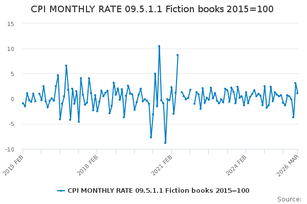 Download this time seriesCPI MONTHLY RATE 09.5.1.1 Fiction books 2015=100