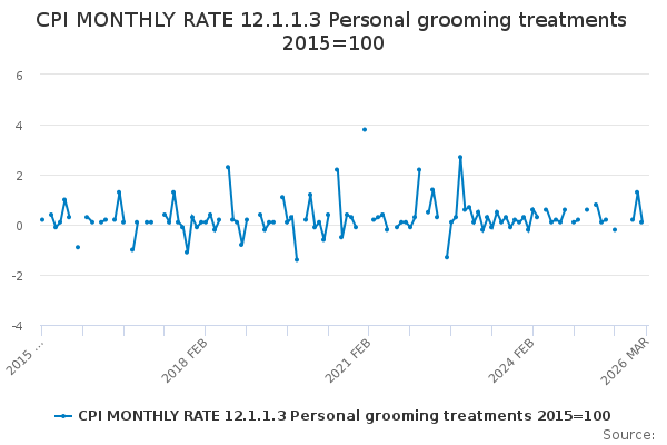 Download this time seriesCPI MONTHLY RATE 12.1.1.3 Personal grooming treatments 2015=100