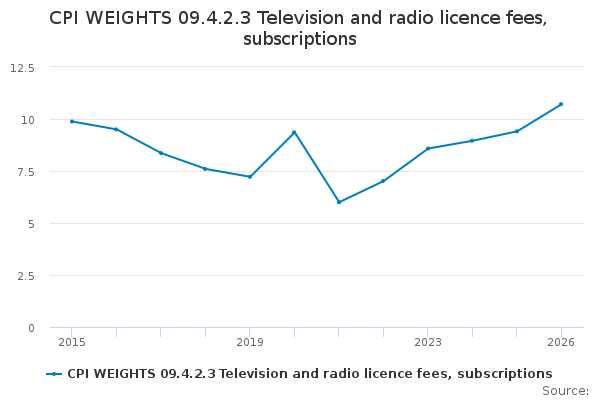 Download this time seriesCPI WEIGHTS 09.4.2.3 Television and radio licence fees, subscriptions
