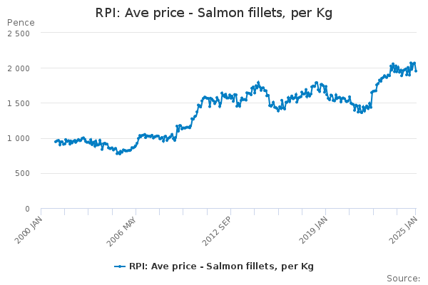 Download this time seriesRPI: Ave price - Salmon fillets, per Kg
