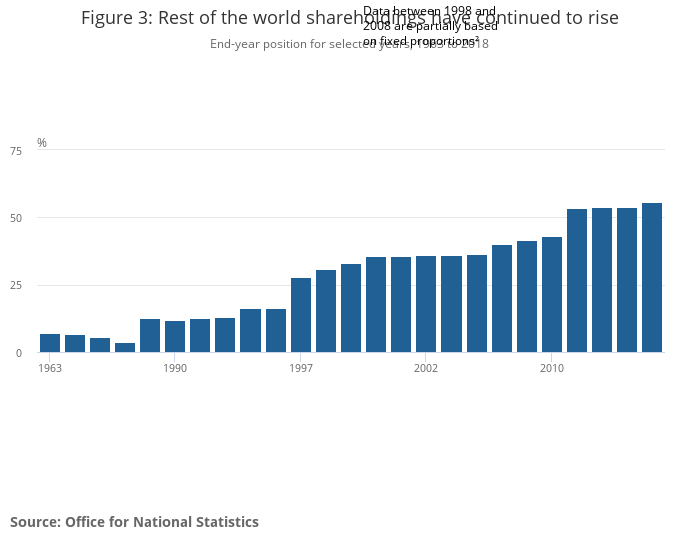 The proportion of UK shares held by the rest of the world increased yet again to set a record high, at 55.7% of the value of the UK stock market.
