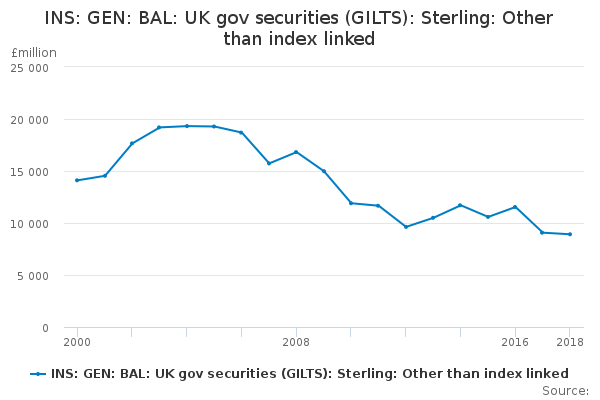 Download this time seriesINS: GEN: BAL: UK gov securities (GILTS): Sterling: Other than index linked