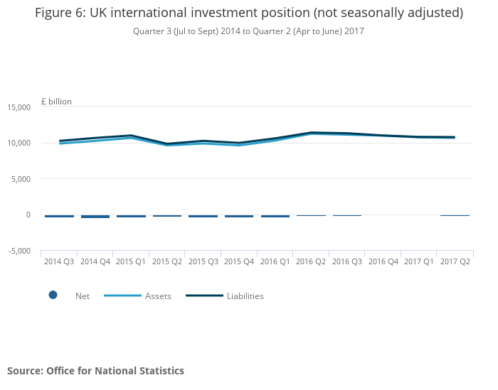 The international investment position shows UK net liabilities of £101.2 billion at the end of Quarter 2 2017.