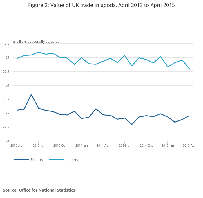 The deficit on trade in goods was £8.6 billion in April 2015. The £2.1 billion narrowing from March 2015 was the largest monthly narrowing since June 2013 when the deficit narrowed by £2.6 billion. Between March 2015 and April 2015, exports rose by £0.7 billion, whilst imports decreased by £1.5 billion over the same period.