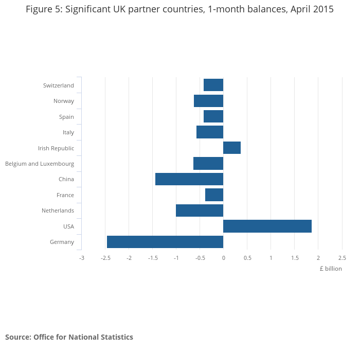 Geographically, in the three months to April 2015 the UK’s surplus with the USA increased by £1.3 billion to £3.8 billion due mainly to an increase in exports of chemicals and machinery. The UK’s deficit with Canada narrowed by £0.9 billion as imports fell by £0.8 billion in the three months ending April 2015. In the same period, the UK’s deficit with the Switzerland widened by £2.1 billion, as exports fell by £1.7 billion. This fall in exports is mainly due to the high level of export activity between the UK and Switzerland at the end of 2014.