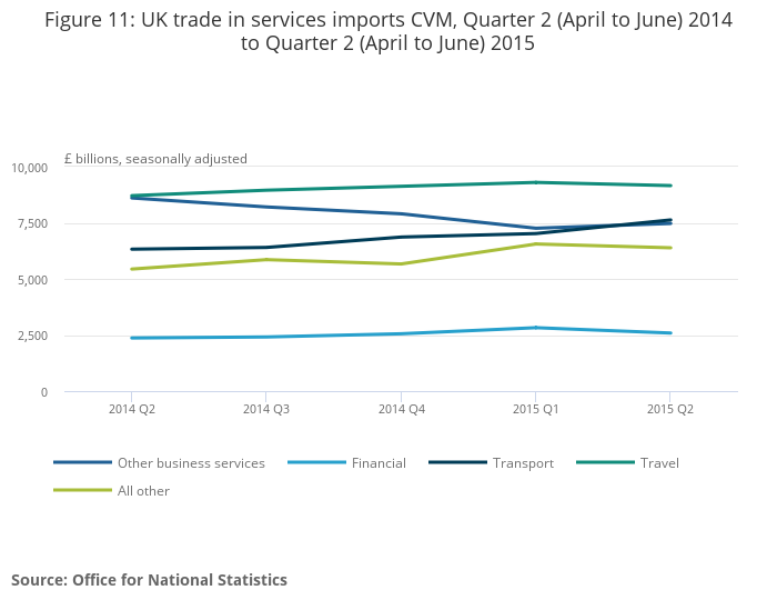 Between Quarter 1 January to March 2015 and Quarter 2 April to June 2015 exports of services were broadly unchanged with a decrease in financial services being offset by increases in travel and transport services. Over the same period, imports increased by £0.3 billion reflecting increases in transport services.