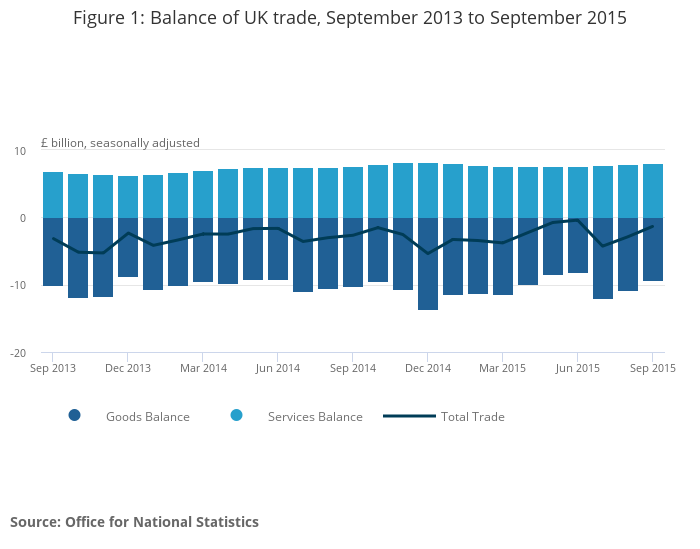 The UK’s deficit on trade in goods and services was estimated to have been £1.4 billion in September 2015, a narrowing of £1.6 billion from August 2015. The narrowing is attributed to trade in goods, where the deficit decreased from £10.8 billion in August 2015 to £9.4 billion in September 2015
