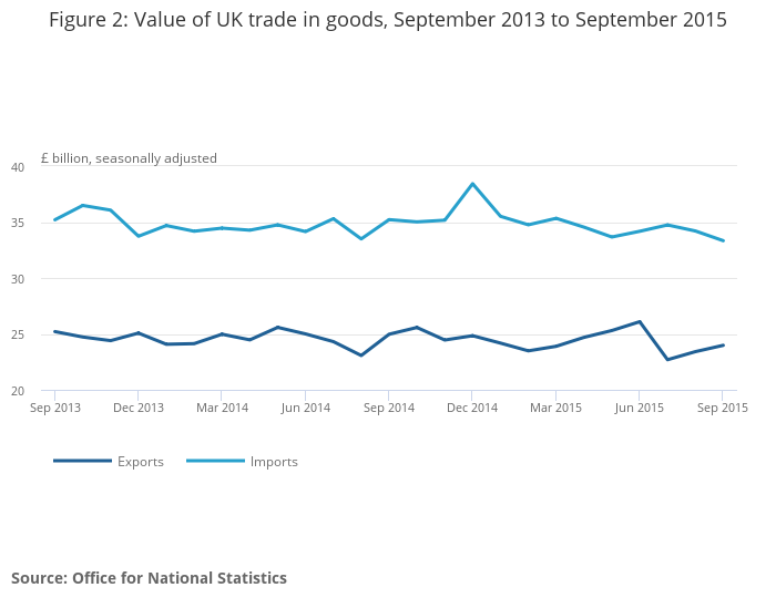 Exports of goods increased by £0.6 billion to £24.0 billion in September 2015, this was attributed to an increase in chemicals of £0.6 billion. Imports of goods decreased by £0.9 billion to £33.3 billion over the same period, this was attributed to a decrease in unspecified goods of £1.0 billion
