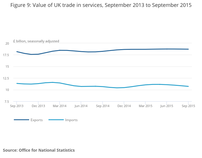 Between quarter 2 (April to June) 2015 and quarter 3 (July to September) 2015, the trade in services surplus widened by £0.8 billion to £23.6 billion, as imports fell 2.4%