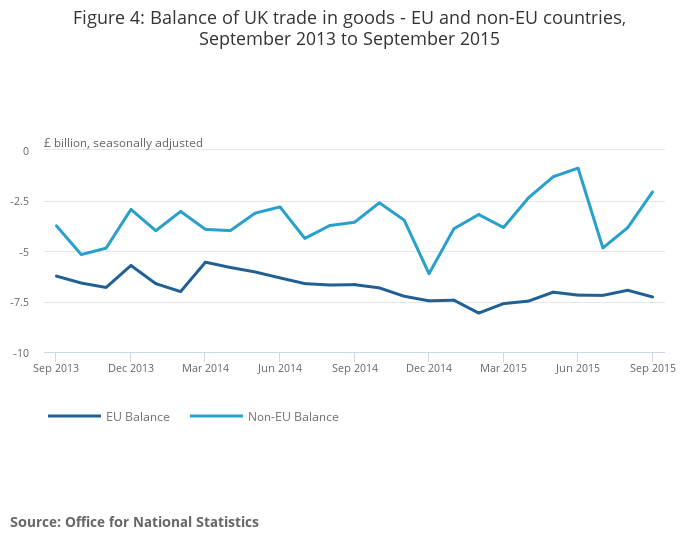 Exports of goods to EU countries fell by 2.1% (£0.2 billion) in September 2015 with exports of oil falling by £0.4 billion. Imports to the EU increased by 0.5% (£0.1 billion); mainly due to a rise in imports of aircraft. These movements resulted in a trade in goods deficit with EU countries of £7.3 billion in September 2015.