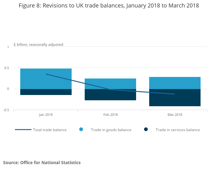 Revisions resulted in an upward £0.3 billion net contribution to the total trade balance in January 2018 and downward contributions of £22 million and £0.1 billion in February and March 2018 respectively.