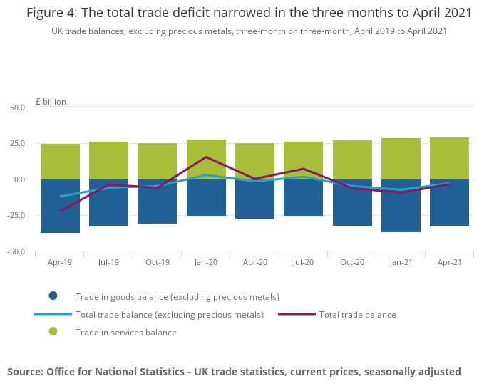 - In the three months to April 2021, the total trade deficit, excluding precious metals, narrowed by £4.4 billion to £3.2 billion.