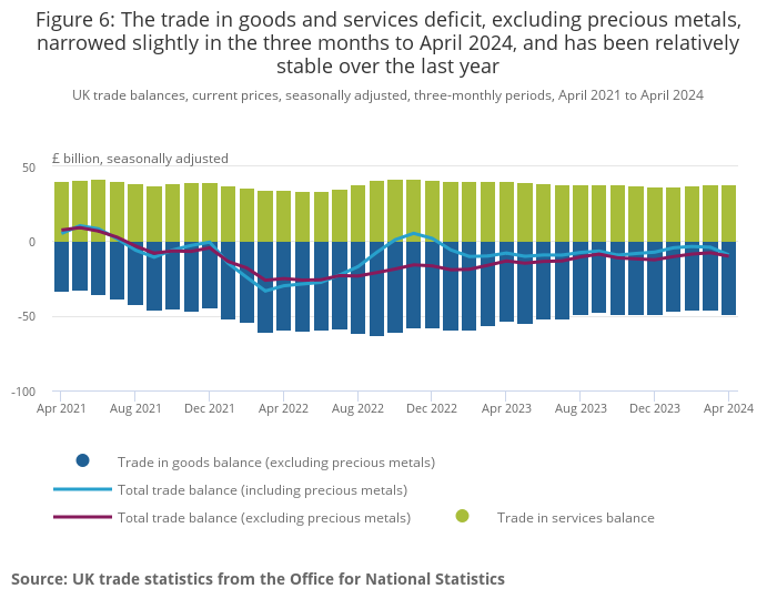 - The total goods and services trade deficit narrowed slightly by £0.3 billion to £10.1 billion in the three months to April 2024, and has been relatively stable over the last year.