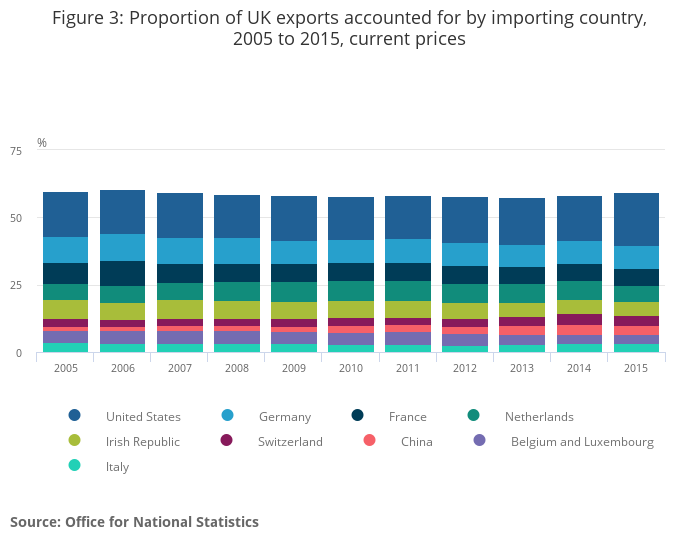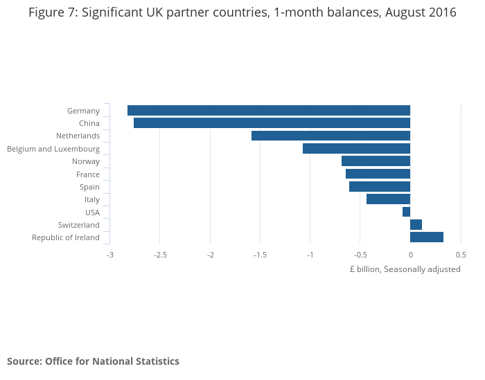 Between the 3 months to May 2016 and the 3 months to August 2016, the UK’s trade in goods deficit with the EU widened by £0.8 billion to £23.9 billion. Between the 3 months to May 2016 and the 3 months to August 2016, the UK’s trade in goods deficit with countries outside the EU widened by £2.5 billion to £10.7 billion, attributed to a decrease in exports (1.3%) and an increase in imports (4.3%).