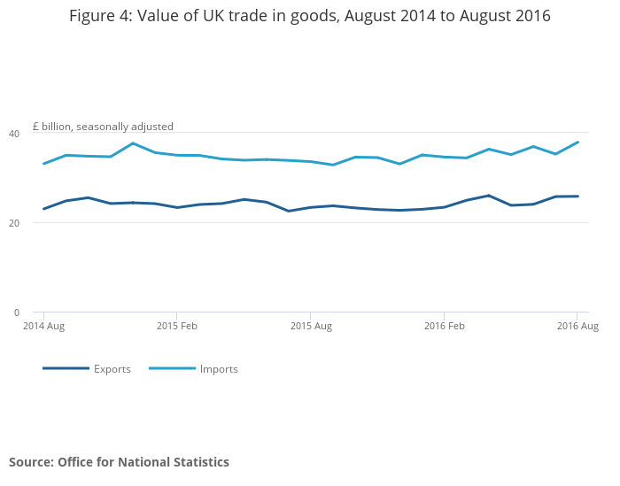 The UK’s deficit on trade in goods and services was estimated to have been £4.7 billion in August 2016, a widening of £2.5 billion from July 2016. Exports increased by £0.1 billion and imports increased by £2.6 billion.