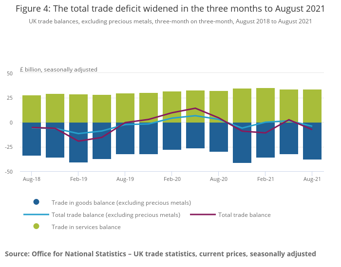 The total trade balance, excluding precious metals, decreased by £5.5 billion to a deficit of £4.2 billion in the three months to August 2021, driven by a decrease in the trade in goods balance, excluding precious metals.