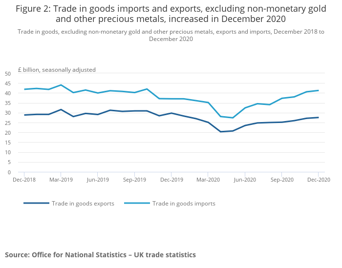 • The total trade deficit for December 2020, excluding non-monetary gold and other precious metals, widened by £0.3 billion to £5.6 billion; imports increased by £0.8 billion and exports increased by £0.4 billion.