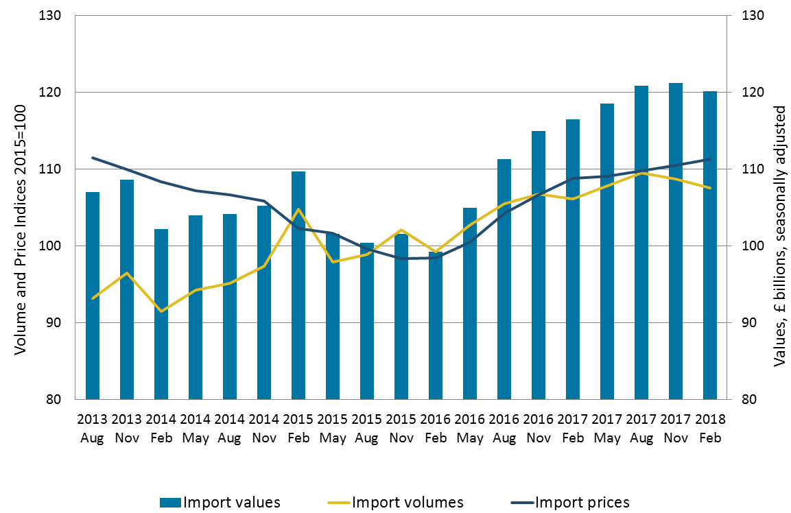 The £1.1 billion decrease in the value of total goods imports to £120.2 billion was due to volume decreases in the three months to February 2018. Total goods import volumes decreased by 1.1%, while total goods import prices rose by 0.8%. The decrease in import volumes is the second consecutive three-month decrease.