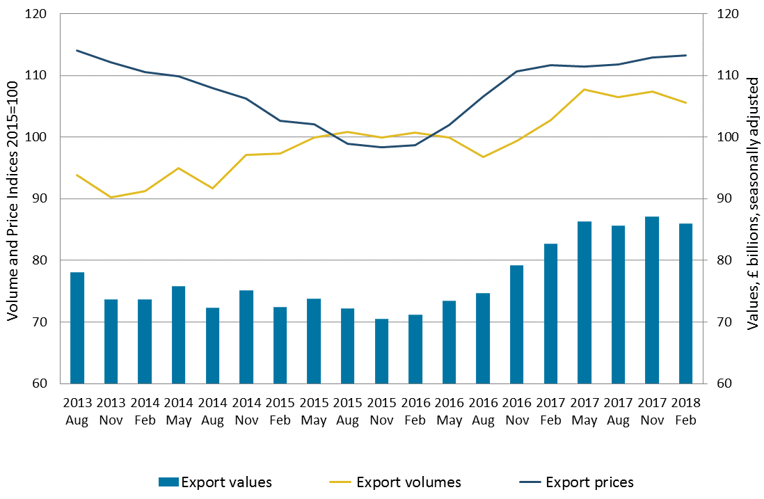 Download this image Figure 4: Three-month on three-month UK goods export values, volumes and prices, August 2013 to February 2018