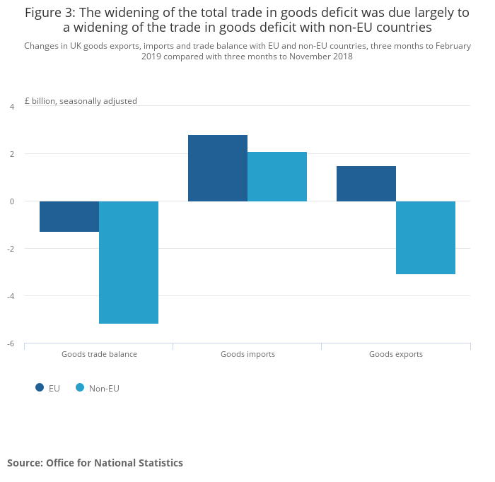 - The trade in goods deficit widened with both EU and non-EU countries in the three months to February 2019