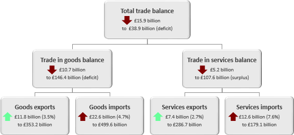 | Trade in goods | Increased £11.8 billion (3.5%) to £353.2 billion | Increased £22.6 billion (4.7%) to £499.6 billion | Decreased £10.7 billion to £146.4 billion (deficit) |