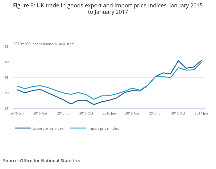 Between December 2016 and January 2017, export prices increased by 2.1% and import prices increased by 2.5%. The value of sterling was 1.7% lower in January 2017 compared with the December 2016 average, following appreciation in November and December 2016. However, it remains 13.1% lower when compared with January 2016.