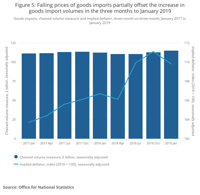 Imports of goods increased £1.1 billion in current prices compared with a rise of £2.3 billion in chained volume measures as prices fell by 1.1% in the three months to January 2019.