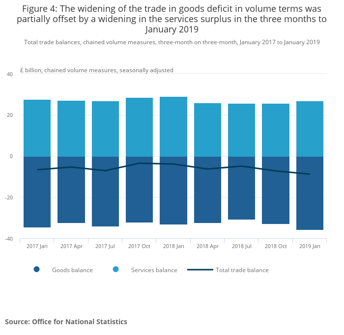 The total trade deficit (goods and services) widened £1.3 billion in the three months to January 2019, as the trade in goods deficit widened £2.4 billion, partially offset by a £1.1 billion widening of the trade in services surplus.
