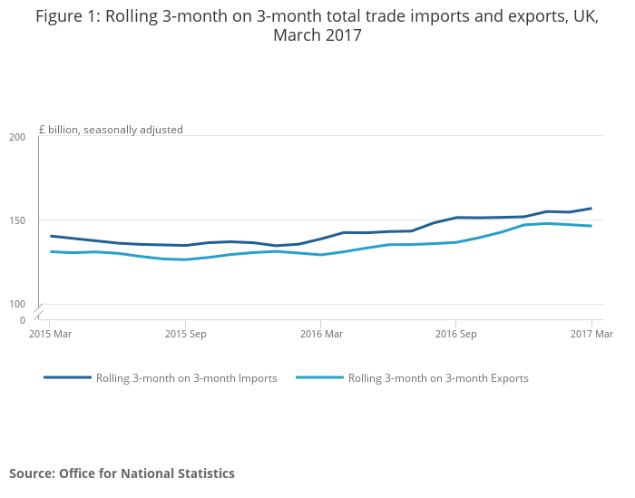 Figure 1: Rolling 3-month on 3-month total trade imports and exports, UK, March 2017