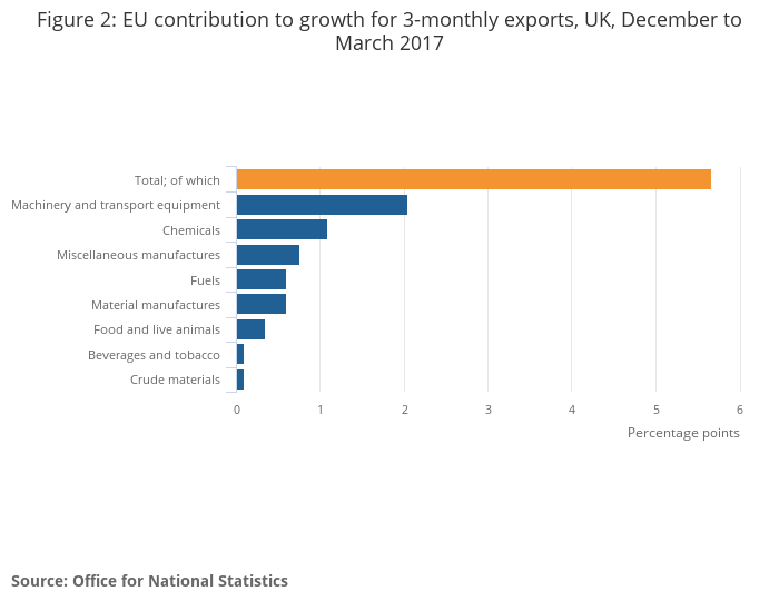 Figure 2: EU contribution to growth for 3-monthly exports, UK, December to March 2017