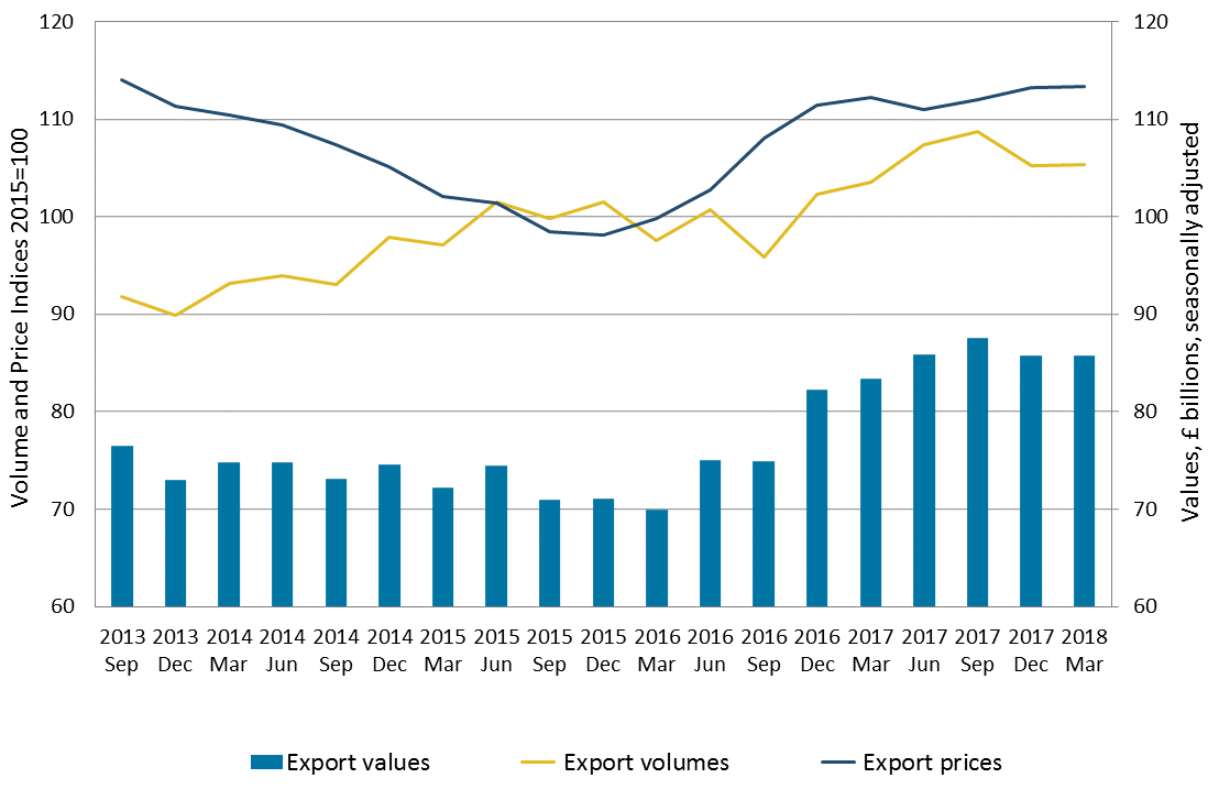 The value of goods exports increased by less than 0.1% in the three months to March 2018; export prices rose by 0.1% and export volumes increased by 0.1% (Figure 4). This compares with the three months to December 2017 when export values fell 2.0%, due mainly to a 3.2% fall in export volumes.