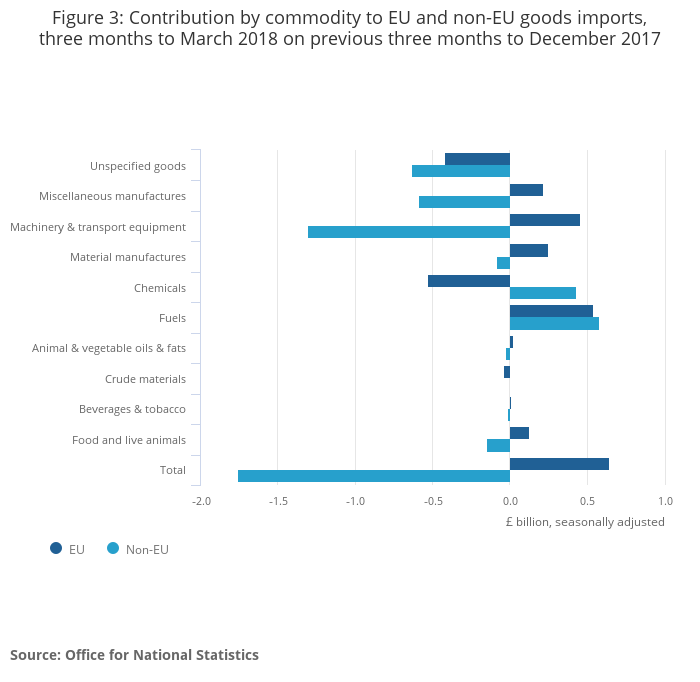 The narrowing goods deficit with non-EU countries was due mainly to falls in imports of machinery and transport equipment (mainly ships and aircraft), and miscellaneous manufactures (mainly clothing and works of art) of £1.3 billion and £0.5 billion respectively in the three months to March 2018.