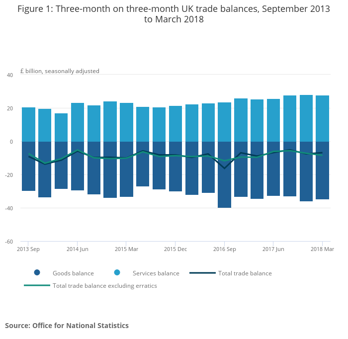 The total trade deficit (goods and services) narrowed £0.7 billion to £6.9 billion in the three months to March 2018. This follows three periods when the deficit widened, by £2.5 billion, £3.0 billion and £0.3 billion, in the three months to December 2017, January 2018 and February 2018 respectively.
