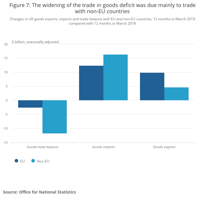 The £14.3 billion widening in the trade in goods deficit in the 12 months to March 2019 was due mainly to trade with non-EU countries. The trade in goods deficit widened £11.7 billion with non-EU countries and by a lesser £2.6 billion with EU countries in the 12 months to March 2019.