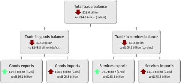 | Trade in goods | Increased £14.4 billion (4.2%) to £356.1 billion | Increased £28.8 billion (6.0%) to £505.5 billion | Decreased £14.3 billion to £149.3 billion (deficit) |