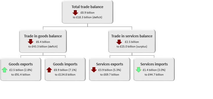 | Total trade | Decreased £1.4 billion (0.8%) to £161.2 billion | Increased £7.5 billion (4.4%) to £179.5 billion | Decreased £8.9 billion to £18.3 billion (deficit) |