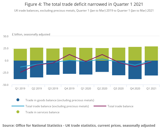 In Quarter 1 2021, the total trade deficit, excluding precious metals, narrowed by £8.4 billion to £1.4 billion.