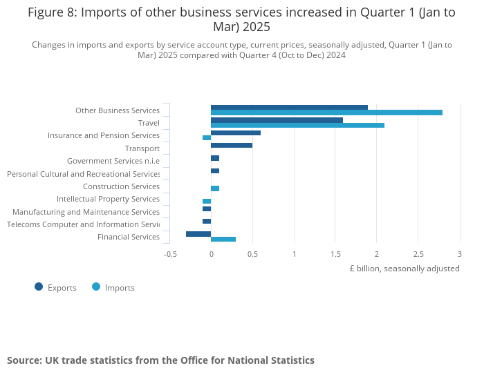 Early estimates indicate that imports of services increased by £5.1 billion (6.4%) in Quarter 1 (Jan to Mar) 2025 compared with Quarter 4 (Oct to Dec) 2024. The largest rises in imports were a £2.8 billion increase in other business services and a £2.1 billion rise in travel services (Figure 8).