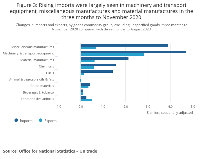 The increase in the total trade deficit was driven by an increase in the trade in goods deficit. The underlying trade in goods deficit widened £0.6 billion to £12.5 billion in November 2020. Goods imports increased £2.6 billion while goods exports increased £1.9 billion (Figure 2). November saw rising imports in machinery and transport equipment, particularly electrical machinery, which includes equipment for distributing electricity and household equipment. It should be noted, however, that monthly data are erratic and small movements in these series should be treated with caution.