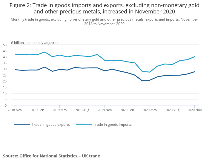 The total trade deficit for November 2020, excluding non-monetary gold and other precious metals, widened by £0.6 billion to £1.5 billion; imports increased £2.4 billion (4.9%) and exports increased £1.9 billion (3.9%).