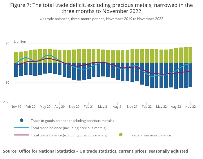 The trade in goods and services deficit, excluding precious metals, narrowed by £6.5 billion to £20.2 billion in the three months to November 2022, driven by a decrease in goods imports from non-EU countries which is linked to falling fuel prices.